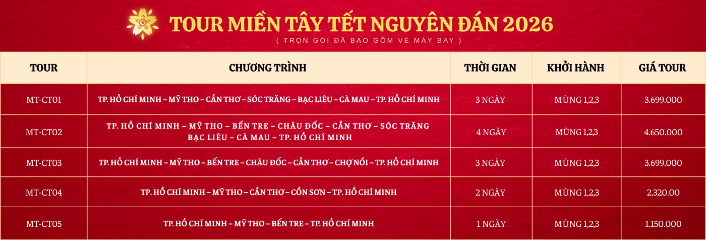 Tour Du Xuân Mỹ Tho - Cần Thơ - Sóc Trăng - Bạc Liêu - Cà Mau